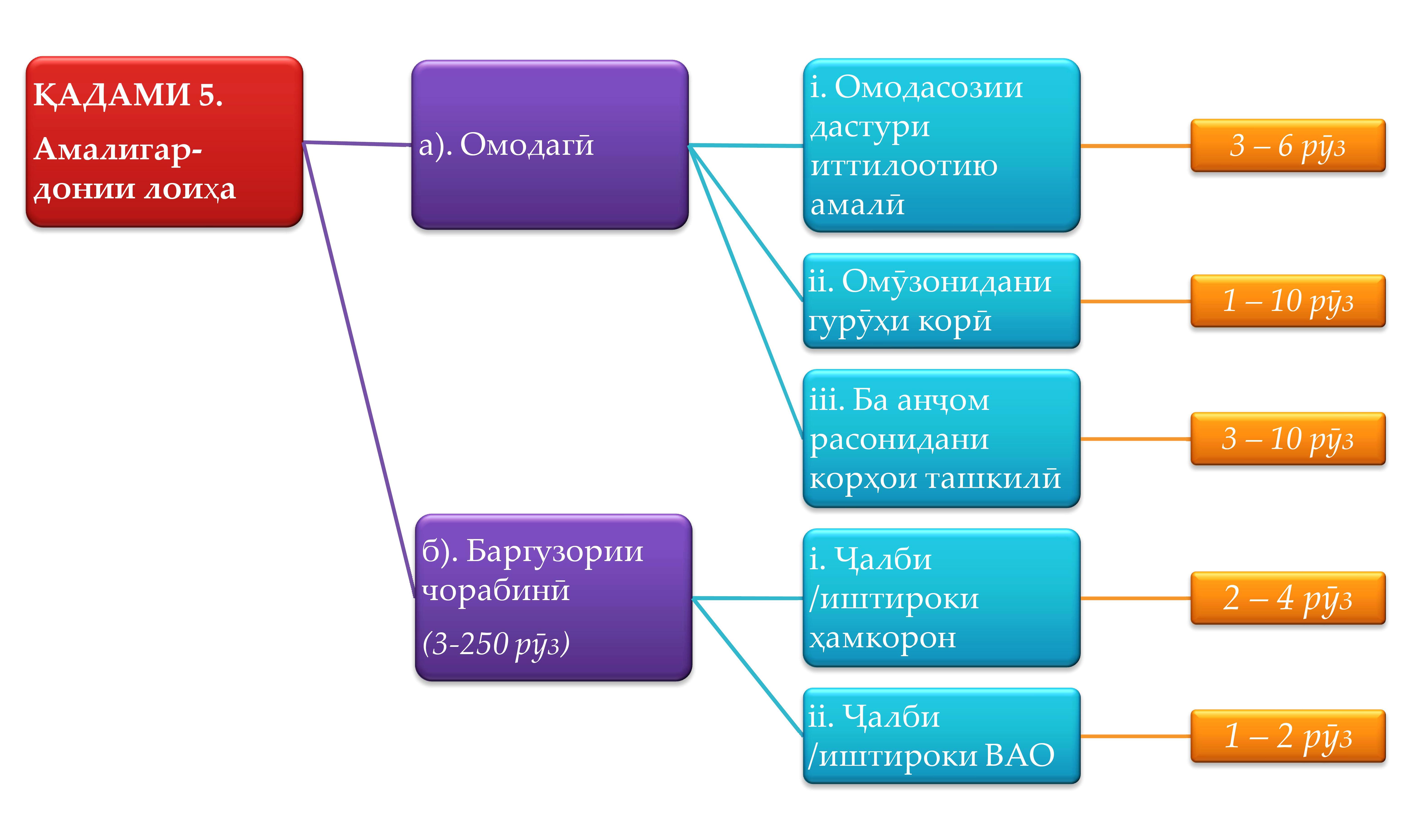 - ва дигар корҳои ташкилию ҳуқуқие, ки барои амалисозии лоиҳа зарур мебошанд.