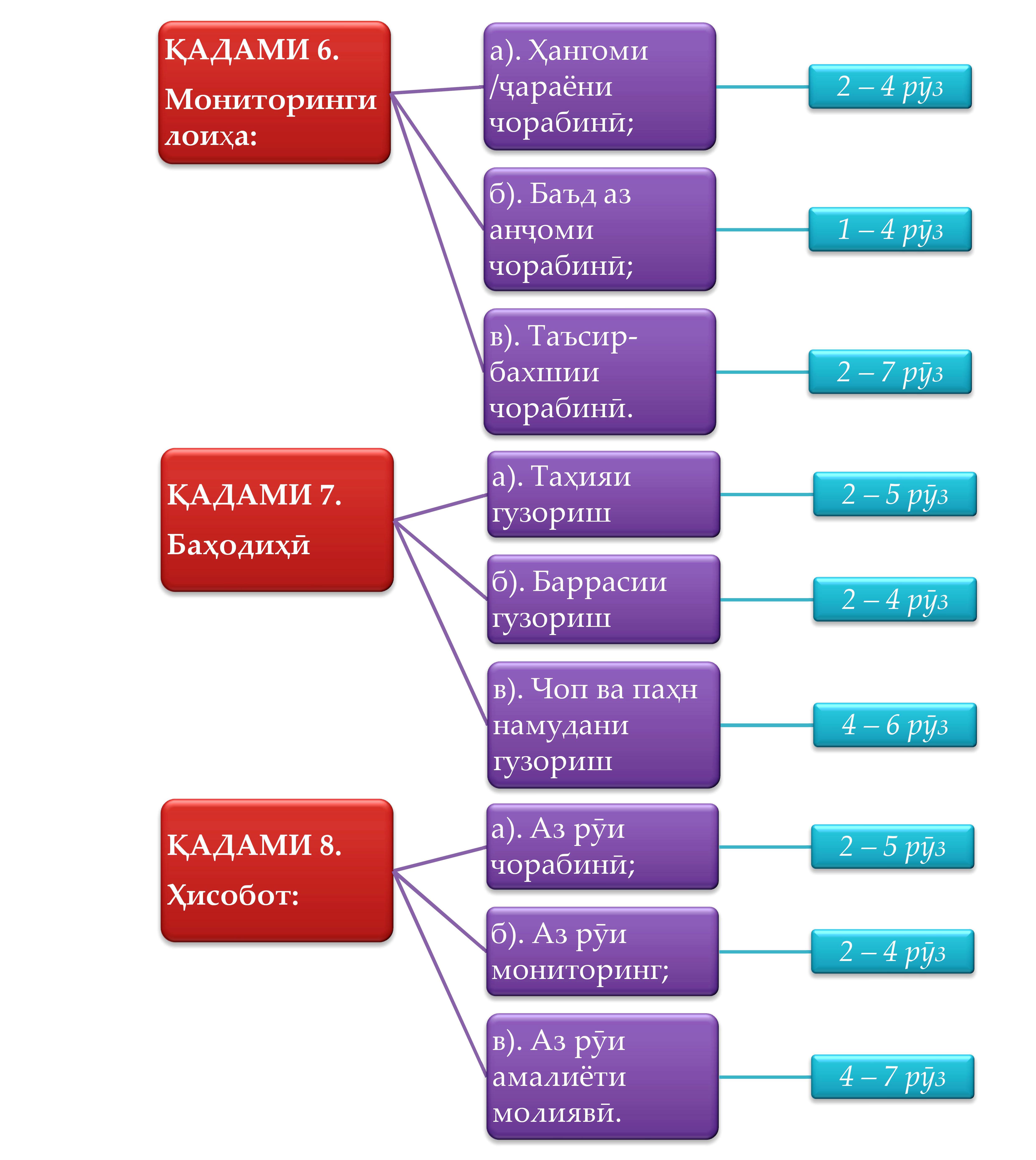 - таҳияи нақшаи мониторинги лоиҳа дар асоси қисми е) қадами 3.
