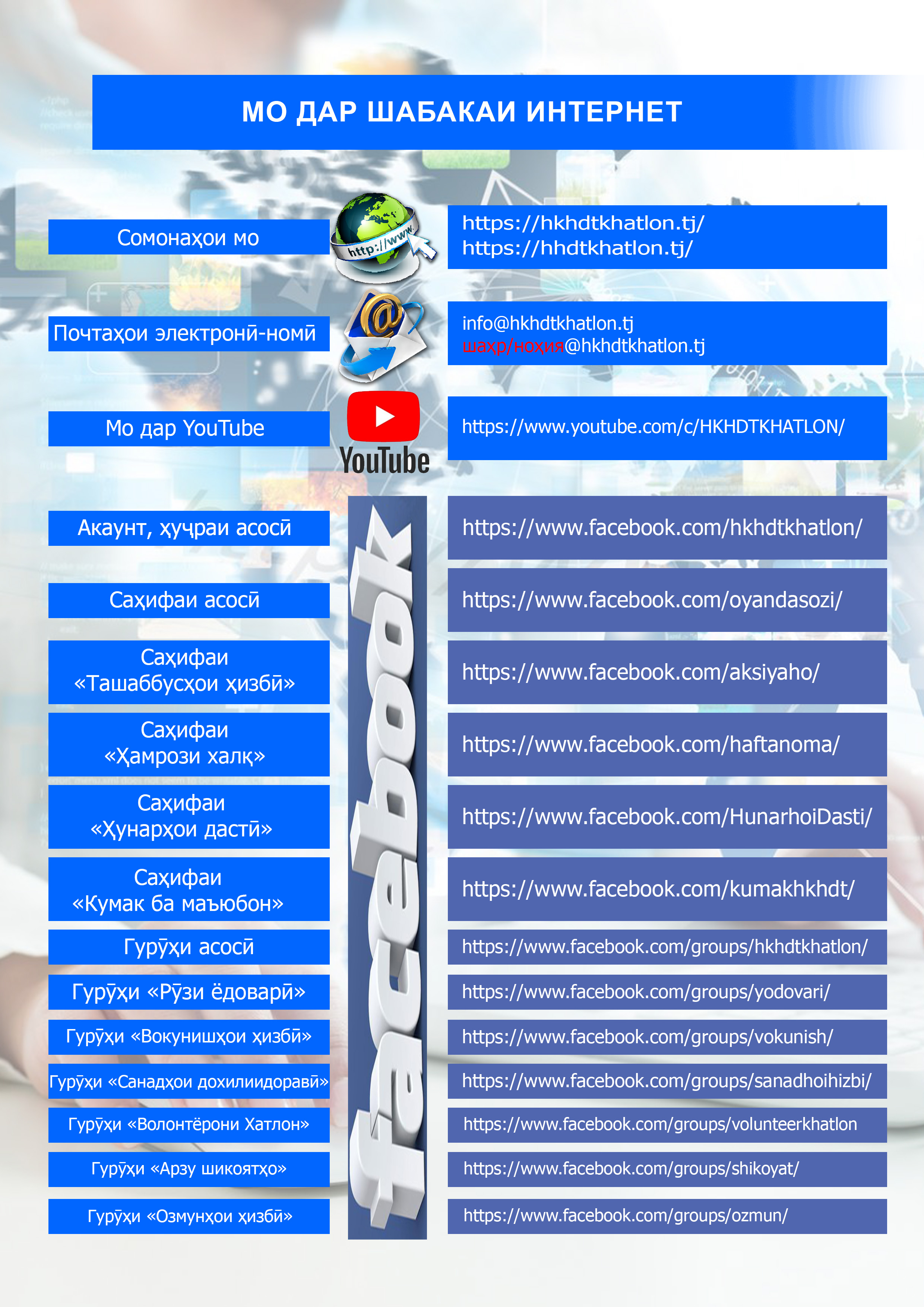 Аз ҷумла, дар сомонаи Кумита http://www.hhdtkhatlon.tj — 1237 мавод ва саҳифаҳои иҷтимоӣ — 9472 маводҳо нашр гардида, тариқи почтаи электронӣ — 4898 мактуб ирсол/ворид гардид. Аз ин шумора, дар умум дар шабакаи Интернет 9935 мавод ва тариқи сомона 668 андеша ва 473 вокунишҳо чоп ва паҳн карда шуд.