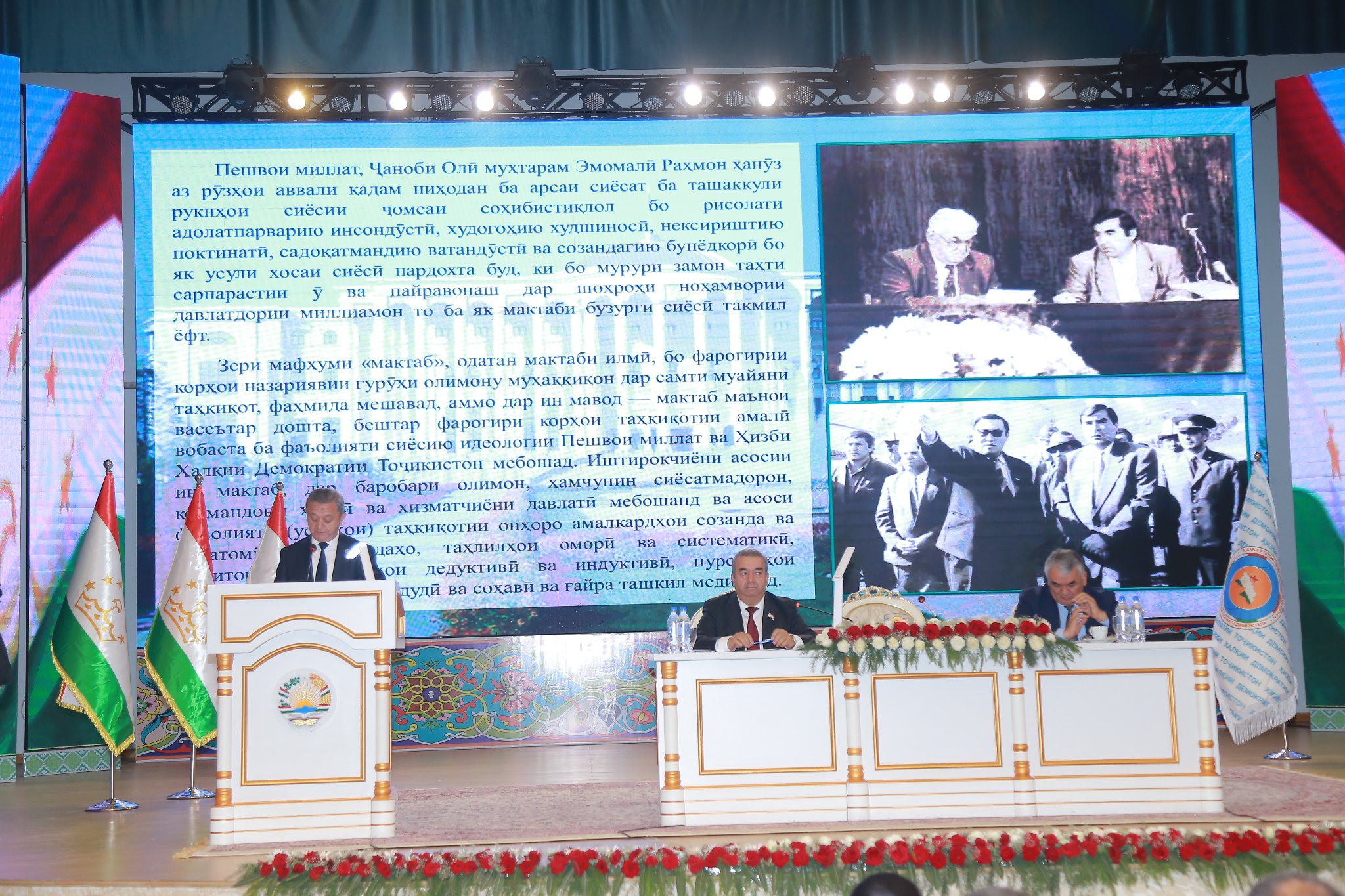 Ҳамин тариқ, бо манзури таҳким бахшидани рукнҳои илмӣ-амалии фаъолият ва ҳадафҳои барномавии Ҳизби Халқии Демократии Тоҷикистон ҳамчун мактаби сиёсӣ, ҳамзамон дастовардҳои сиёсии Ҷумҳурии Тоҷикистон дар давраи Истиқлолияти давлатӣ зери унвони «Мактаби сиёсии Пешвои миллат» ҳамасола баргузор намудани конференсияи илмии амалӣ ташаббус гардид. Ин конференсияи илмӣ соли 2020 дар сатҳи ҷумҳурӣ, дар ш.Бохтар (дар ҳамкорӣ бо Донишгоҳи давлатии Бохтар) бо иштирок 50 олимону муҳаққиқон ва 6 октябри соли 2021 дар ҳамкорӣ бо Донишгоҳи давлатии Данғара дар ноҳияи Данғара бо иштироки 150 нафар олимону муҳаққиқони донишгоҳҳо ва донишкадаҳо, Академияи миллии илмҳо ва академияҳои соҳавии ҷумҳурӣ баргузор шуд. Конференсия дар шакли мустақим ва фосилавӣ (онлайн) доир гардида, дар он олимон, муҳаққиқон, ходимони сиёсӣ аз донишгоҳу донишкадаҳои шаҳру ноҳияҳои Душанбе, Хуҷанд, Кӯлоб, Данғара ва хориҷи кишвар (Россия, Украина ва Молдова) дар чаҳор бахш: «Сиёсатшиносӣ ва идоракунӣ», «Иқтисодиёт ва энергетика», «Ҳуқуқ, амнияти миллӣ ва муносибатҳои байналмилалӣ», «Кишоварзӣ ва саноатикунонӣ» бо пешниҳоди 80мақолаҳои илмию таҳлилӣ ширкат намуданд.