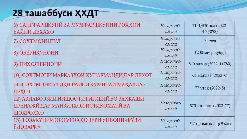 Ҳамчунин, бо ҳавасмандгардонии соҳибкорон, саховатмандон, вакилони мардумӣ ва сокинони маҳал 1141 км роҳҳо сангфарш ва 570 км роҳҳо мумфарш карда шуда шуданд.