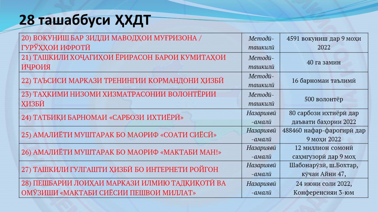 Ҳамин тариқ, дар асоси таҳлилҳои боло ва дастури Пешвои миллат, Раиси муаззами ҳизб дар яке аз ҳамоишҳо, ки иброз карда буданд, — имрӯз Ҳизби Халқии Демократии Тоҷикистон ба бознигарӣ ва таҷдиди усули кор бо мардум, пешниҳод ва татбиқи идеяҳои нави замонавӣ ниёз дорад – ҲХДТ ва сохторҳои он дар маҳалҳо тайи се соли охир гурӯҳи идеяҳои созандаву бунёдкор ва ҳамқадам ба ҷомеаи муосирро ташаббус карданд, аз ҷумла тарғибу ташвиқ ва саҳмгузории ташкилию амалӣ дар татбиқи чорабиниҳо бахшида ба 30 ва 35 солагии Истиқлолияти давлатӣ, бахусус дар сатҳи маҳалу деҳот.