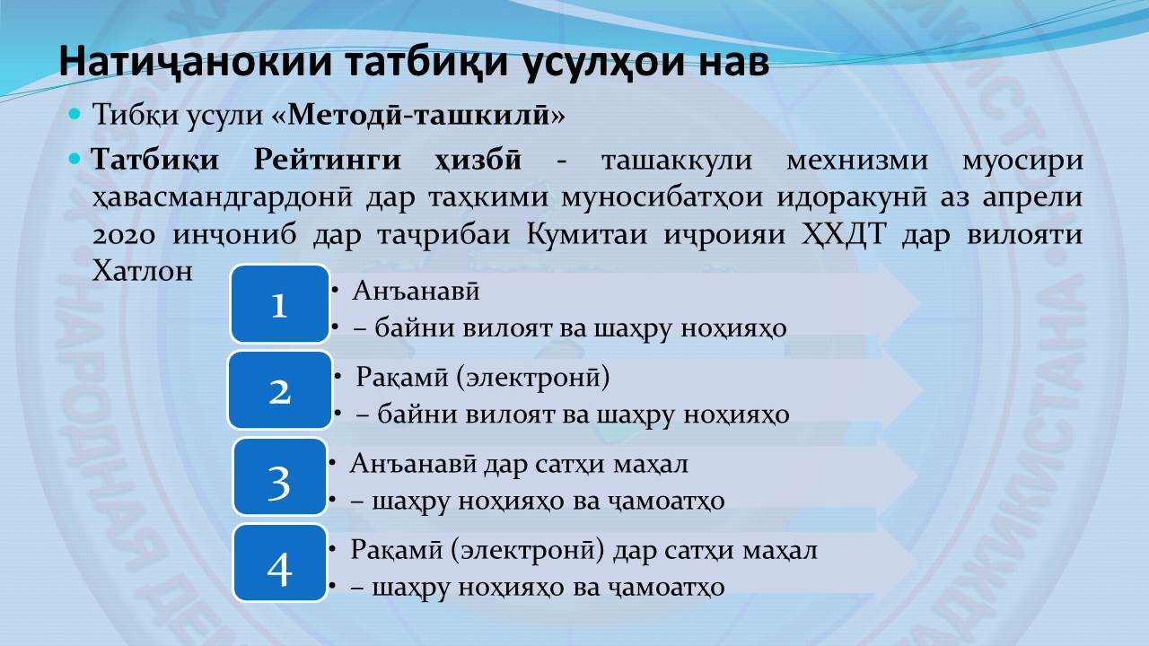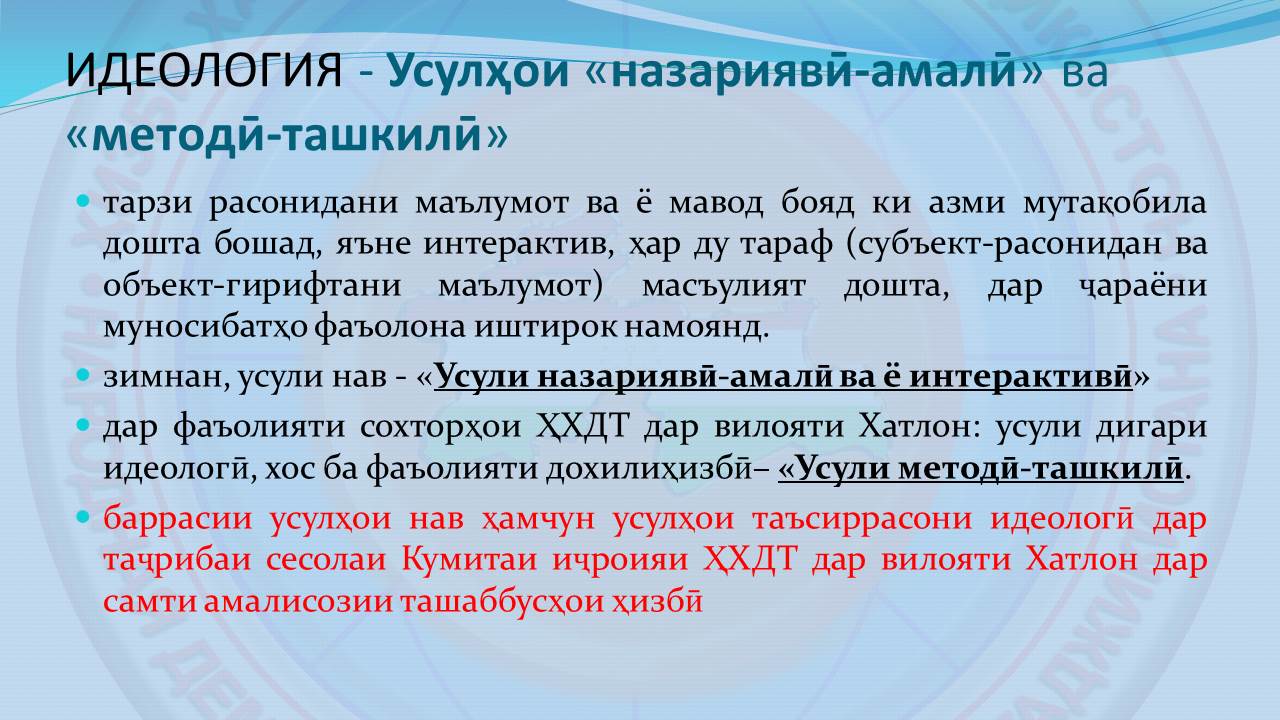 Пеш аз баррасӣ бояд иброз намуд, ки дар фаъолияти сохторҳои ҲХДТ дар вилояти Хатлон боз як усули дигари идеологӣ низ, хос ба фаъолияти дохилиҳизбӣ амалӣ мегардад – «Усули методӣ-ташкилӣ. Ин усули нави идеологӣ дар ҳошияи талаботи ҷомеаи муосир, таҳкими асосҳои идоракунии институтсионалӣ ва истифодаи самараноки технологияҳои иттилоотӣ дар ҳошияи татбиқи дастуру ҳидоятҳои Пешвои миллат, Раиси муаззами Ҳизби Халқии Демократии Тоҷикистон муҳтарам Эмомалӣ Раҳмон ташаккул ёфтааст.