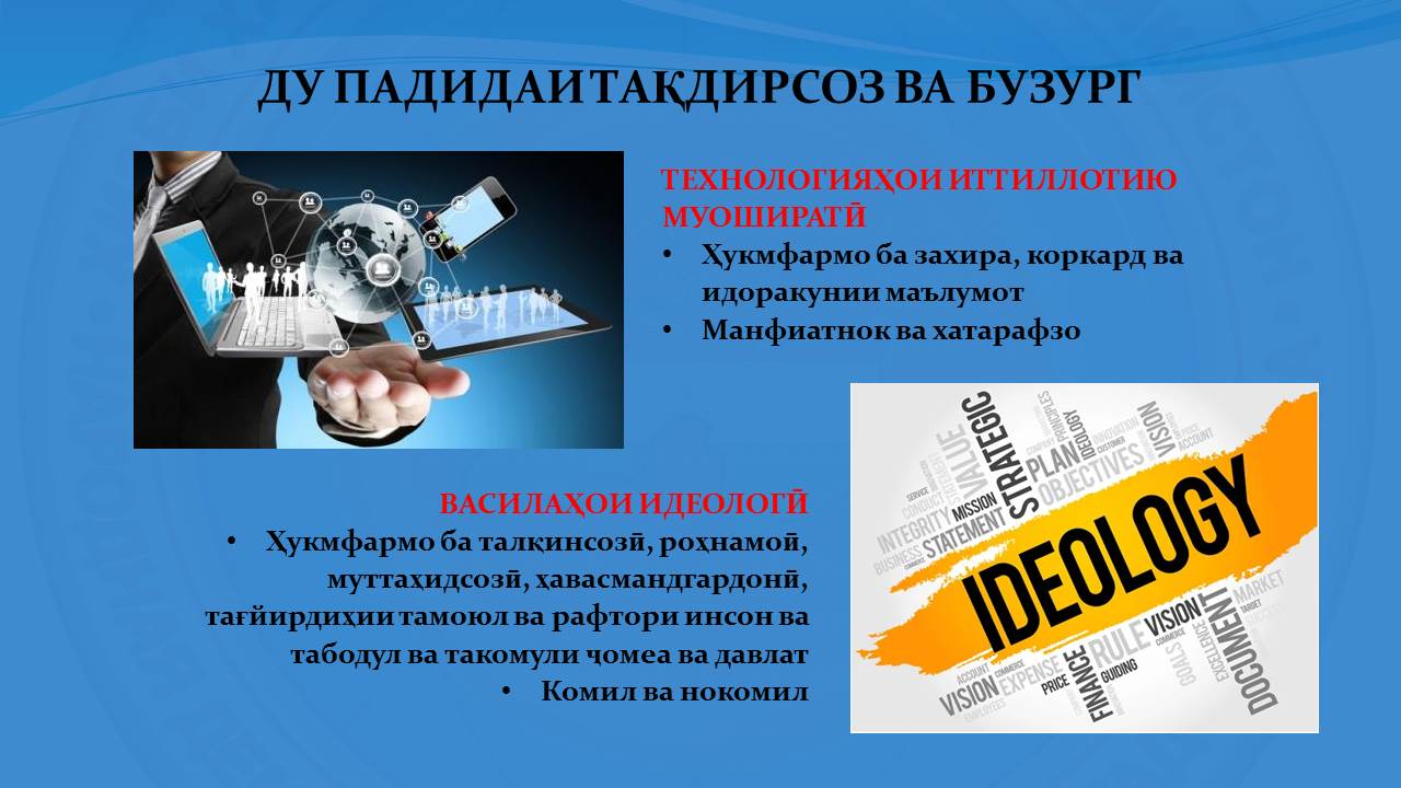 Бояд иқрор шуд, ки дар ҳазораи нав дар баробари технологияҳои иттиллотию муоширатӣ василаҳои идеологӣ низ, рушд карда истода, дар самтбахшии ҳаёту фаъолияти ҷомеаи ҷаҳонӣ ва давлатҳо таъсиргузор мебошад. Зимнан, ин ду василаи тақдирсоз ва бузург бо ҳамдигар дар рақобати шадид буда, дар роҳи мубориза ҷиҳати дарёфти мавқеи хосса дар ҳаёти ҷомеа ва ҷой гирифтан дар мафкура ва вуҷуди ҳар як фард шакли худ, навъ ва усулҳои таъсиррасониро зуд-зуд тағйир медиҳанд.