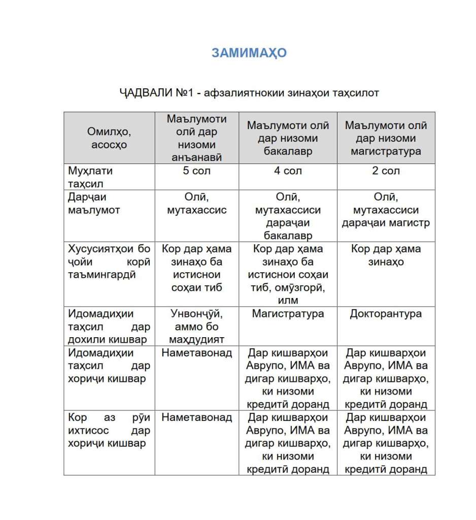 - Тибқи низоми анъанавӣ – таҳсил 5 сол, дараҷаи маълумоти олӣ, мутахассис, имконияти кор дар ҳама зинаҳо ба истиснои соҳаи тиб;