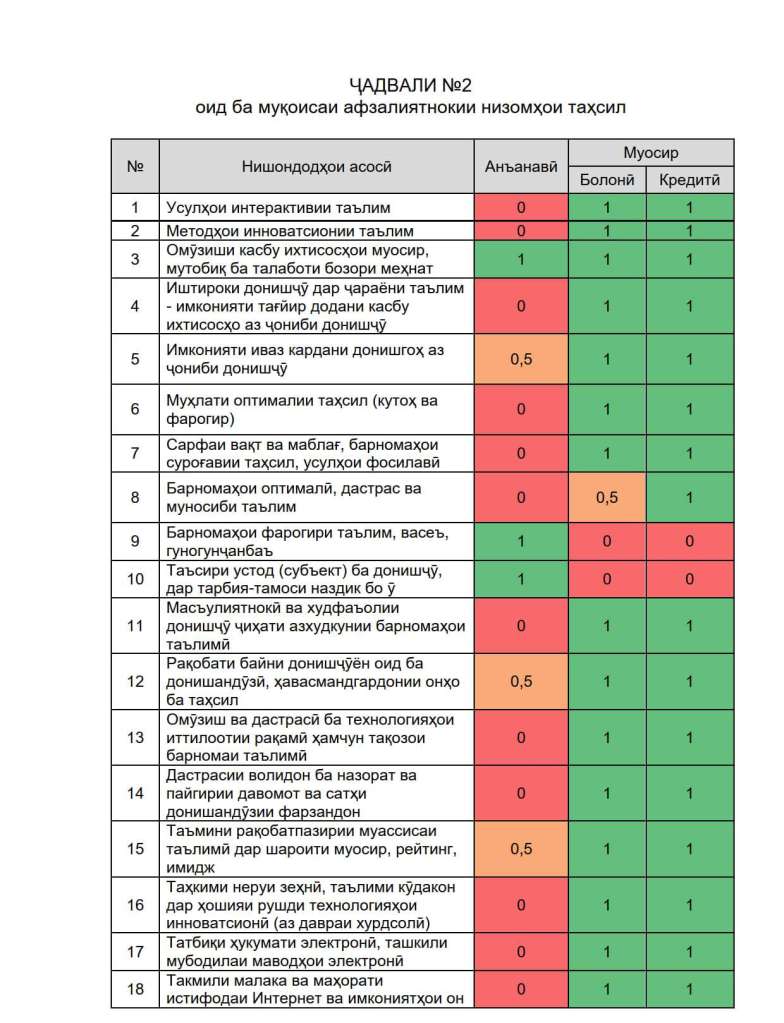 Бо як назар пай бурдан мумкин аст, ки вазифаҳои мазкур тибқи таҳлили Ҷадвали 2 танҳо ба низоми муосири таҳсилот робита дорад, яъне ба андешаи мо низоми анъанавӣ ба татбиқи ин вазифаҳо қобил нест. Сарвари кишвар мо – аҳли зиё ва амалдоронро муваззаф гардонидааст, ки то соли 2027 бояд дар соҳаи маориф ва илм ба нишондодҳои муайян, аз қабили ҷорӣ будани усулҳои фаъол дар низоми маориф, татбиқ гардидани таҷрибаи пешқадам (ин таҷриба дар ҳолати имрӯза – низоми кредитии таҳсил аст) ва навсозӣ ё такмил ёфтани низоми идораи таҳсилот дар шароити замони муосир бирасем.