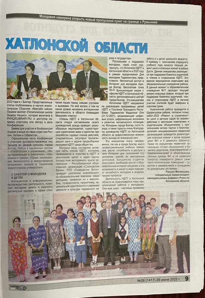 Мактаби сиёсии Пешвои миллат: маводҳои Конференсияи байналмилалии илмӣ-амалӣ бахшида ба 25-солагии Рӯзи Ваҳдати миллӣ – 23-24 июни с.2022. // Маҷмӯаи мақолаҳо №3- 2022, Ҳизби Халқии Демократии Тоҷикистон, Донишкадаи энергетикии Тоҷикистон. – ш.Бохтар: 2022. – С. 26-42